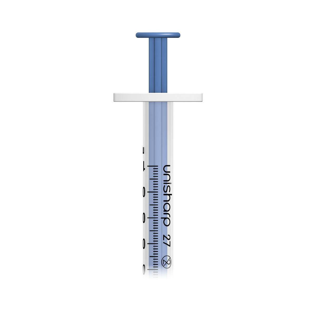 Jeringa de aguja fija Unisharp de 1 ml y 27 G con émbolo azul, ahora con un diseño del cuerpo de la jeringa mejorado y optimizado para la autoinyección.