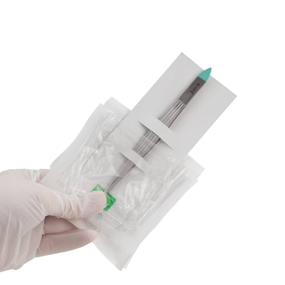 - Fijado sobre una lámina dispensadora de cartón; embalado individualmente y esterilizado